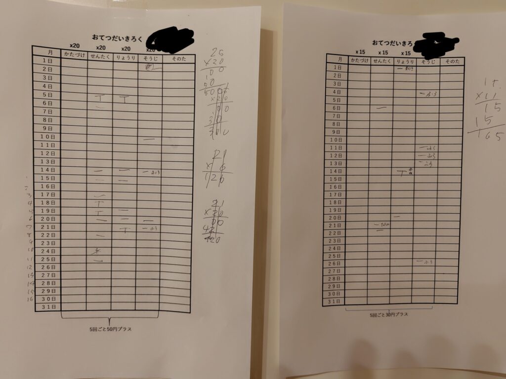 👆こちらが実際のお手伝い記録表です。左が兄の分、右が弟の分になります。